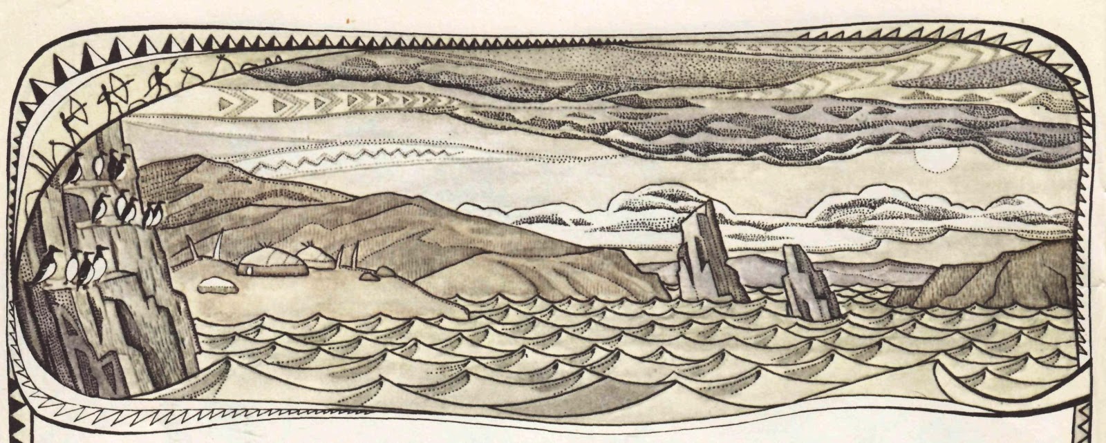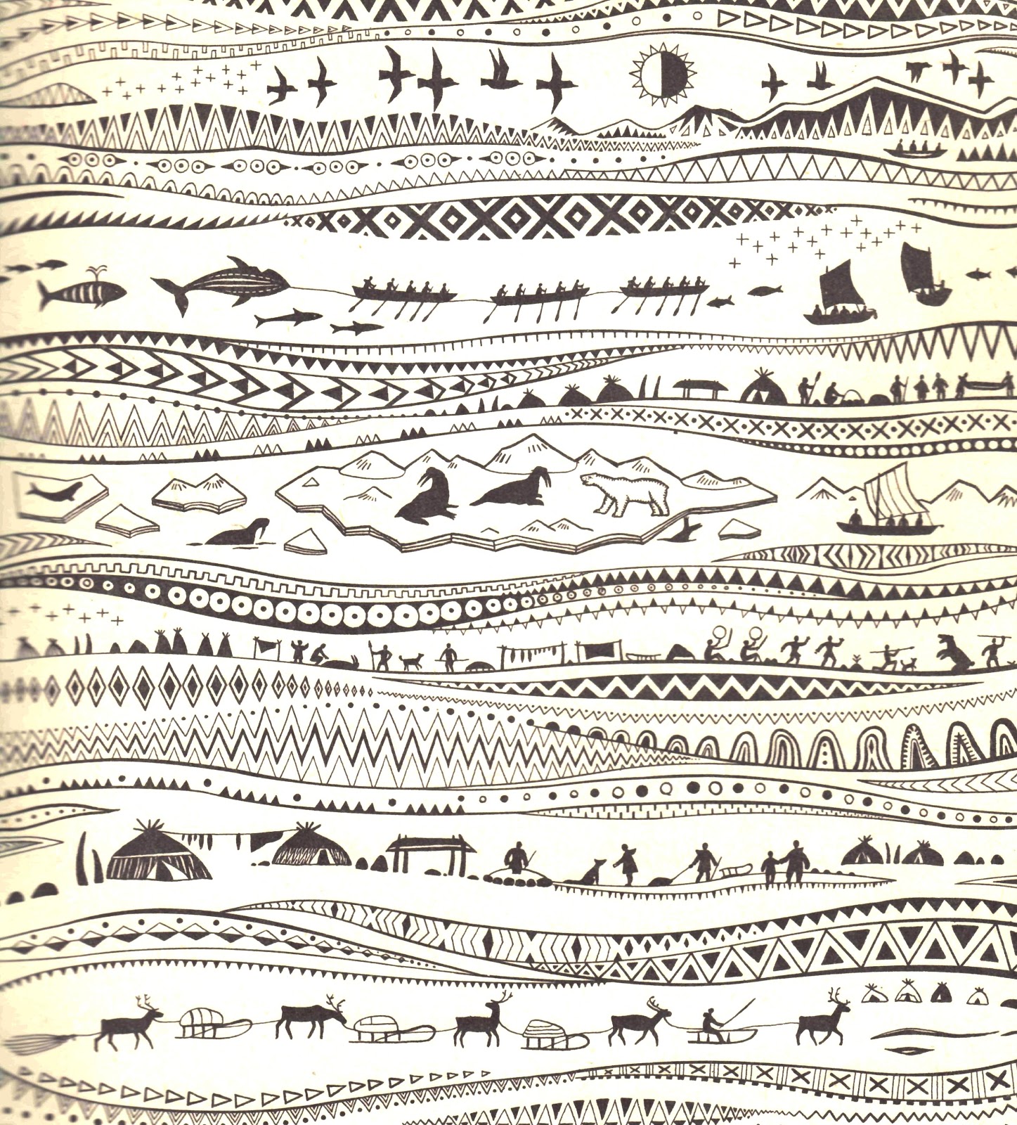 Всю ночь беспокойно стонало море. Билось о камни. Успокоилось только под утро. Проснулись охотники-зверобои — солнце светит, ветерок чуть дышит. Хорошо! Лучшей погоды и желать не надо. Взяли они копья, стрелы и пошли к морю. Но только спустили лодки на воду, как снова, откуда ни возьмись, подул ветер. Заходили волны, как горы высокие. Зашумели, загрохотали льды плавучие. Темно вокруг стало.