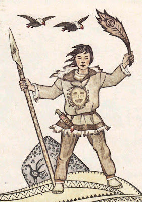 Долго плясали и пели, празднуя победу над чёрной птицей. Потом, когда уже надо было расходиться, охотник Кымынэ вывел Чочоя на середину, чтобы все видели, и, как надо по обычаю, вручил ему копьё из моржовой кости, расписанное в цвета моря и гор Чукотки.